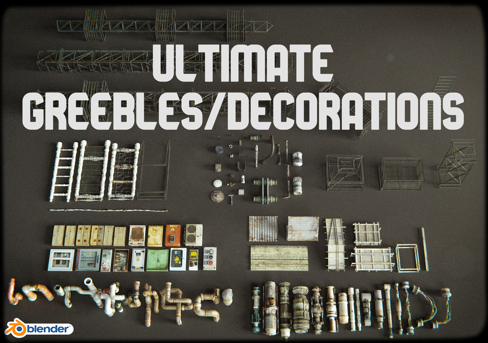 You'll get 94 unique greebles/decorations which you can use to make stuff look complex and detailed with very little work involved.